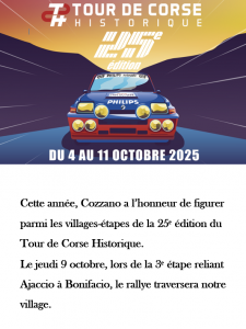 Passage du Rallye Historique – Informations Importantes pour les Habitants Le jeudi 9 octobre 2025, notre commune accueillera le passage du Rallye Historique, un événement automobile d’envergure qui traversera notre canton. Stationnement interdit de 7h00 à 19h00 (Arrêté municipal n° 2024-010 du 28 juillet 2025) dans les secteurs suivants : • Strada Francescu Renucci (du Centre « U Mondu di U Porcu » au Groupe scolaire) • Piazza d’A Parata • Strada d’A Ghesgia • Strada di Zicavu (du quartier Parata au quartier Cinaredda) • Strada di Palleca (du quartier Parata au quartier Noci) Circulation : Elle restera autorisée mais fortement perturbée dans toute la commune. Les voitures du rallye arriveront par le lotissement et stationneront dans le village. Les coureurs se ravitailleront dans la salle des fêtes. Infos cantonales : Les routes D69 (Cozzano - direction Zicavo) et D757 (Bains de Guitera - direction Olivese) ne seront pas fermées, mais la circulation sera très ralentie : Arrivée...